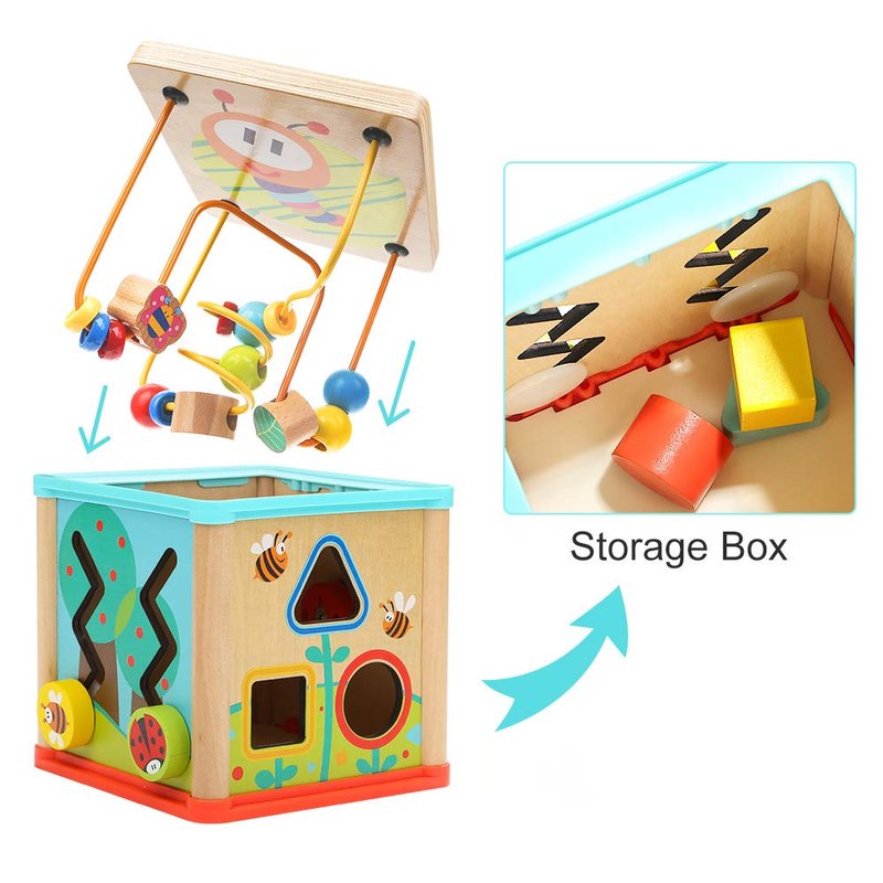 - Portable & Easy store - The top bead maze can be played separately, also flips over and fits inside the box for easy storing. This makes the whole wooden toy easily portable and excellent for toddler travel toy. Activity cube size: w: 6 x d: 6 x h: 5.9 inches.