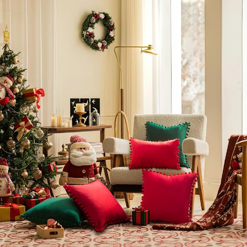 Top Finel Red Decorative Pillow Covers 20x20 Set of 2 for Couch Throw Pillow Covers with Pom Poms, Soft Square Velvet Sofa Pillow Cases for Bedroom Living Room Home Decor