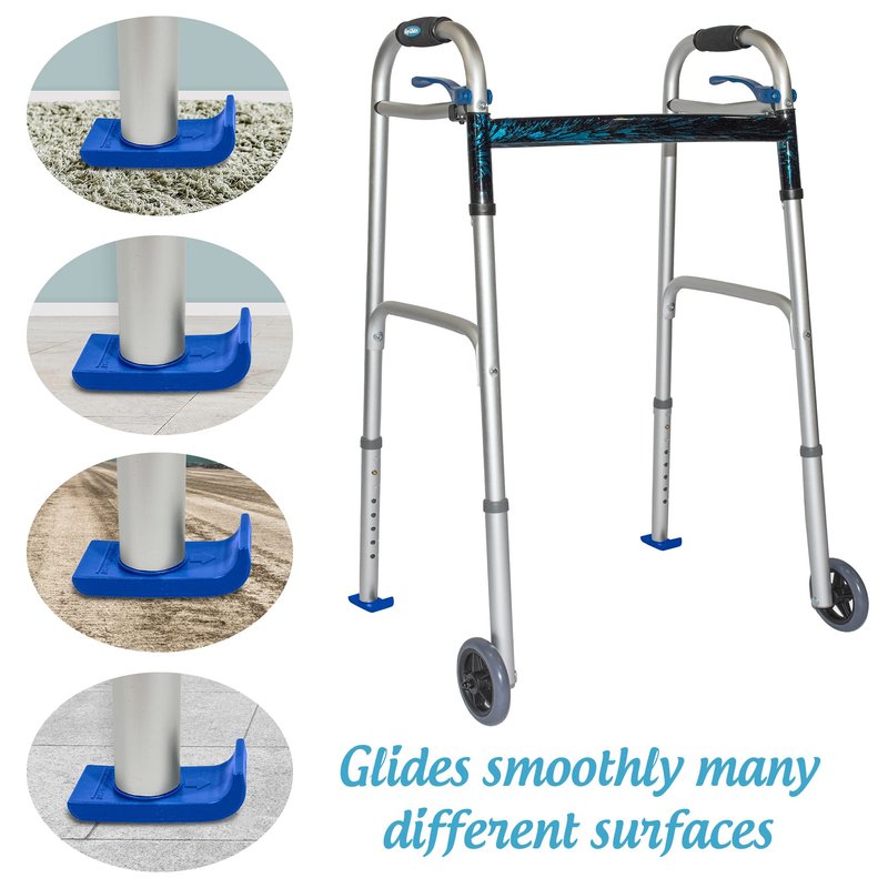 Universal Adjustable FlexFit Ski Glides With "flexible attachment capability" these ski glides will fit most walkers with 7/8" to 1 1/8" diameter legs. The "clipped ski" design is exclusive and provides easier navigation. Thick materials makes these ski glides very durable and able to handle different walking surfaces. FEATURE HIGHLIGHTS: Designed for Most Walkers; Extra-thick High-Density Nylon Plastic; Versatile for Indoors and Outside; Use on Medical Walker Rear Legs Only; Simple to install with a screwdriver