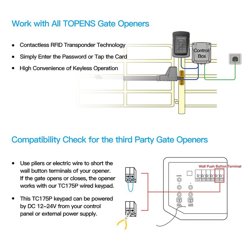 - Wide Compatibility - Works with all TOPENS gate openers, and compatible with most third party swing or sliding gate opener whose control board accepts “Normally Open Dry Contact” signal. It can be powered by the control panel of the access control system or by the external DC 12V-24V power source. Compared with a wireless keypad, TC175P is a perfect solution in locations where frequency interference is occurred or where the control box is installed far away from the gate operator.