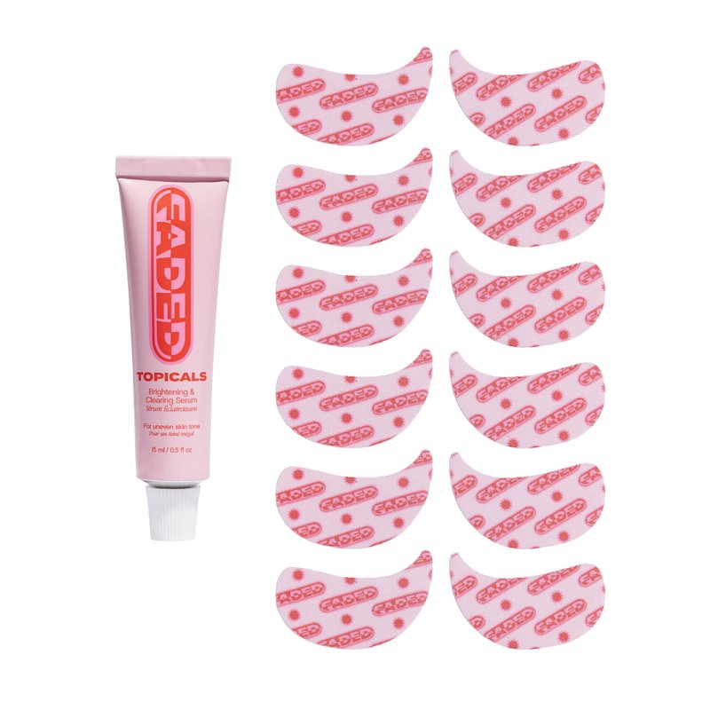 Dark circles, sun damage and pigmented skin? Get Faded Under Eye Masks + Faded Serum – a starter pack to experience our best-selling Faded formula for brightening and evening skin tone. Faded Eye Masks harness the same skin-brightening and evening ingredients you love from Faded Serum to reduce the look of discoloration from dark circles, with added caffeine and a hydrogel formula to soothe, depuff, and hydrate the extra-sensitive skin under your eyes. Patch test prior to use is advised.
