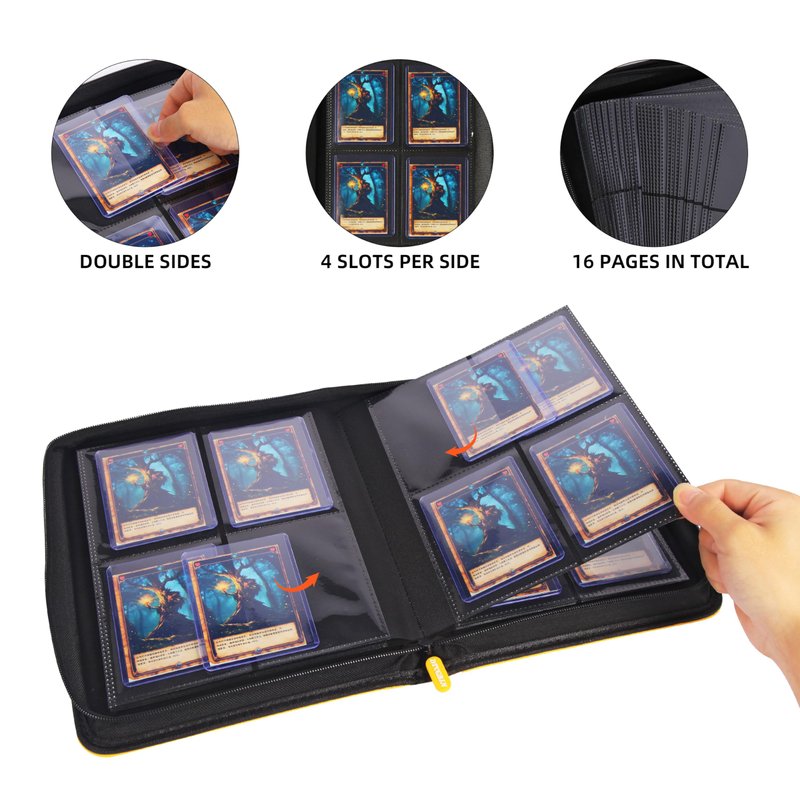 The trading card binder features 4 pockets, allowing for a maximum capacity of 128Top loader Trading Card.The 4-pocket design enables you to quickly flip through and find the specific card you are looking for, eliminating the hassle of flipping through multiple pages.