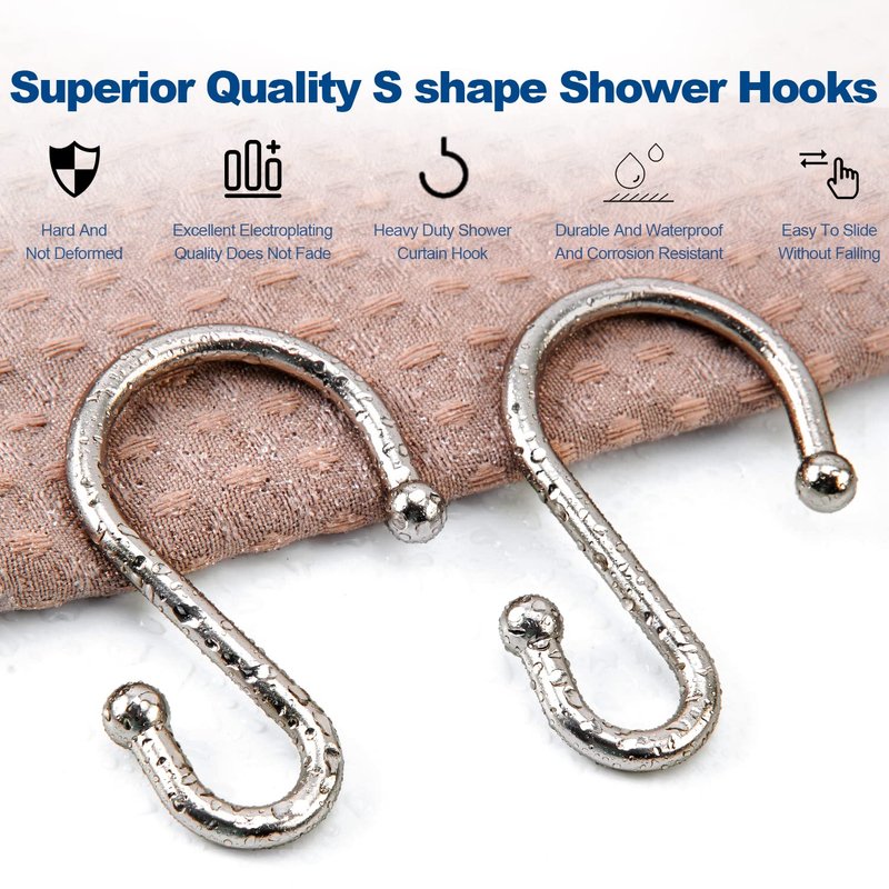 - Unique DESIGN:The shower rings for curtain with S shape reduce friction and tearing and glide easily and smoothly on any diameter. The hook ball is designed to fix the shower hooks on the rod firmly and the metal shower hooks will not fall off easily.
