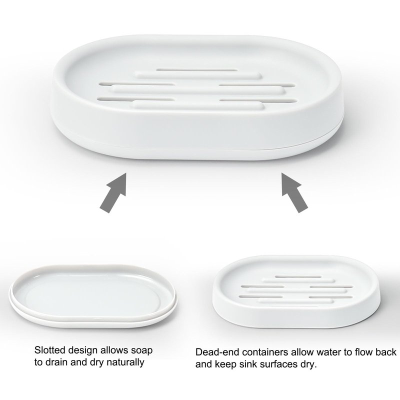 - 【Drains well】Two pieces design, a catch basin(Drainage dish allows enough room to catch excess water) and a top level with open slots that drain. Slats in the top layer are wide enough for water/soap slime can fall through a grate into the bottom. Excess water ends up in the soap bar holder, not on our sink or counter. so the soap drys quickly which saves on soap.