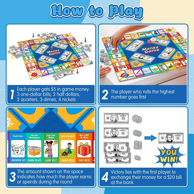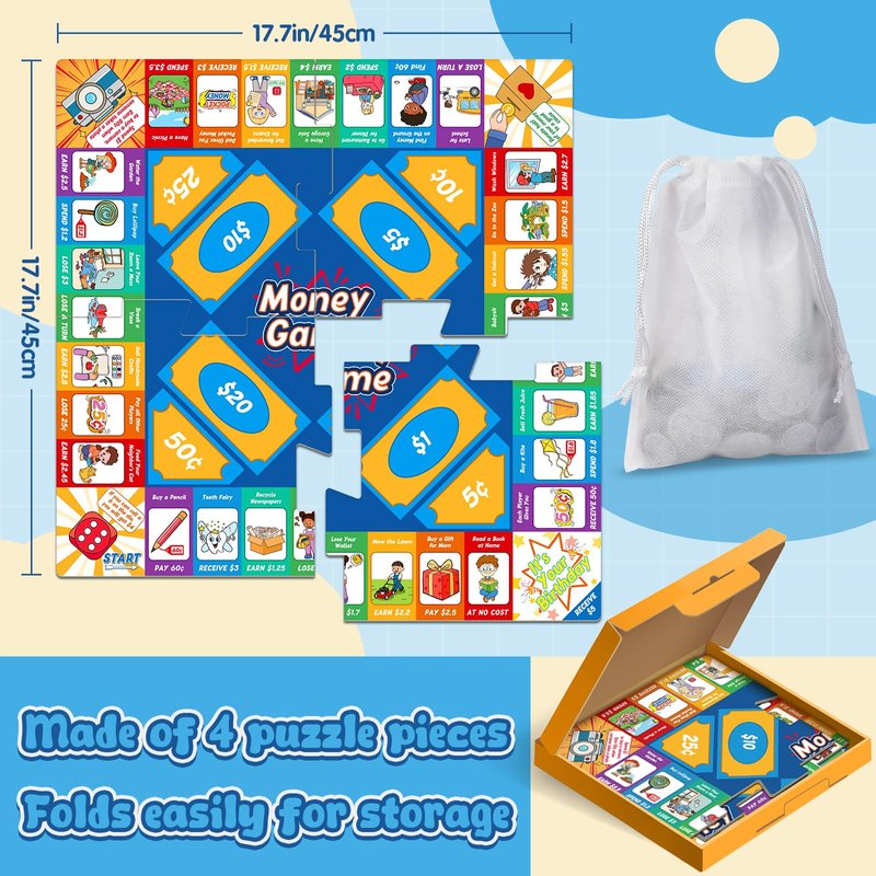 - Complete Game Set – Includes 1 money game board, 1 dice, 4 colorful pawns, 85 play coins, 60 play dollar bills, 1 storage bag, and 1 teaching guide for easy play and storage