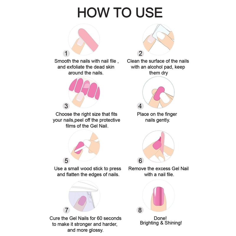 - [EASY APPLICATION & REMOVE] - More easy and convenient, 4 steps to easily finish a new nail polish style, clean(otherwise will be easy to come off),stickup, filing, and light curing. They can last up to 15 days when fully cured by UV light. Easy to remove, just peel them off by wood stick.If still glue remains, please use gel nail polish removerNote: UV/LED lamp Not include in items.