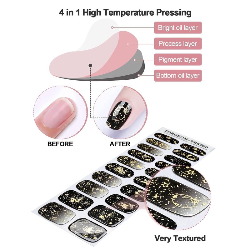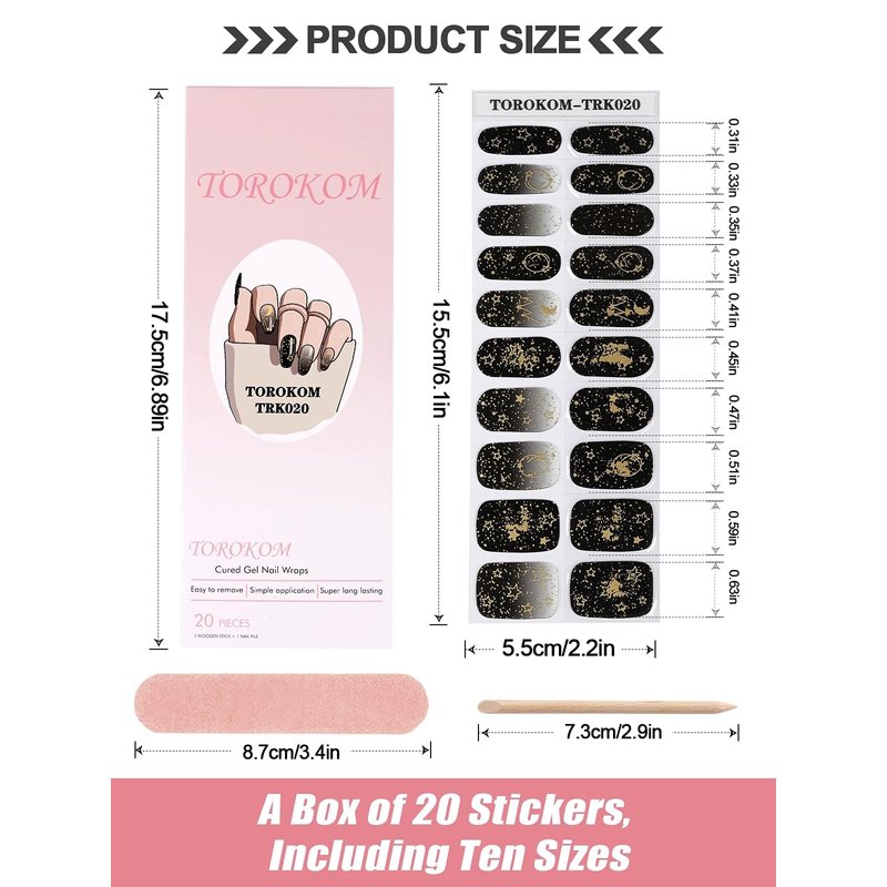 - [REAL GEL NAIL STRIPS] - TOROKOM gel nail strips are made by solidifying real gel nail polish with the cure technique. It finishes your nail with a glossy look which is totally different from conventional paper nail stickers, plastic nail stickers, and acrylic nail tips. Since it is a real gel, curing the sticker on a nail lamp after attaching makes the nail more firm, long-lasting, and glossy.