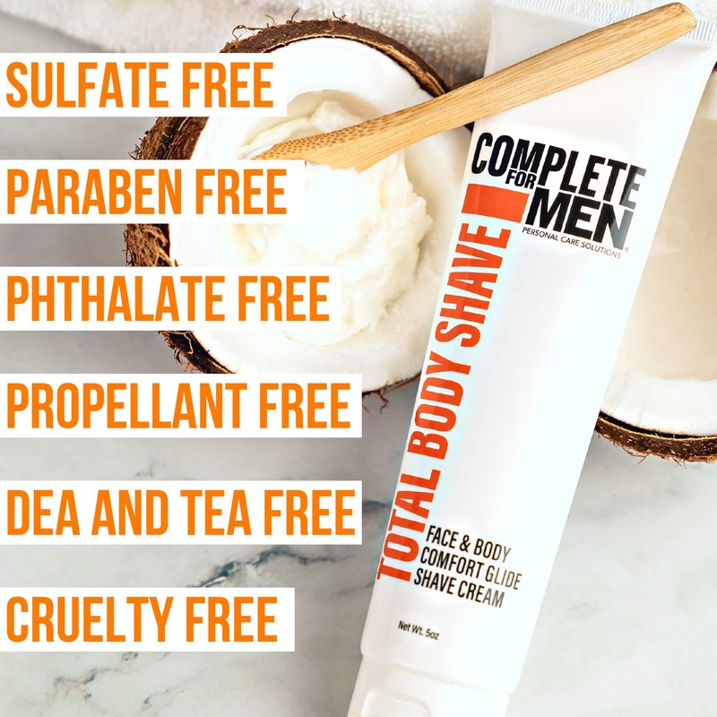 - No Harsh Ingredients: Complete For Men is infused with a powerful blend of natural lubricants and moisturizers. Say goodbye to harsh chemicals. Our Shave Cream adheres to a clean personal standard, free from dyes, sulfates, propellants and parabens. This shave cream is infused with a powerful blend of natural ingredients like shea butter, cocnut oil, jojoba oil, and green tea leaf. Your skin deserves nothing but the best.