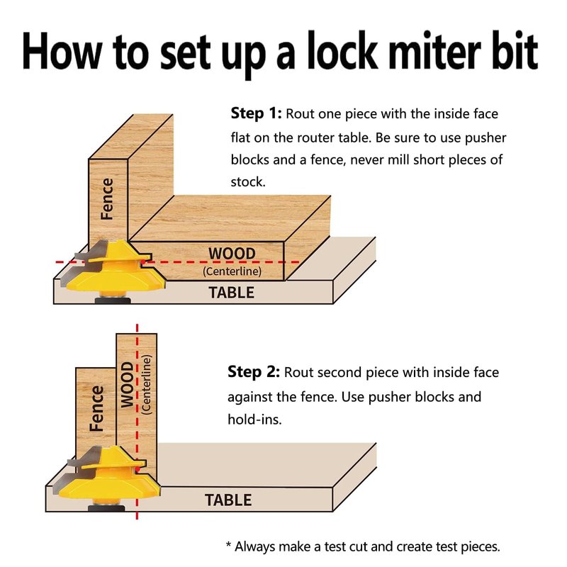- Lock Miter Router Bit Set contains 3 different sizes to meet your diverse work needs.Join boards at a 90 degree angle with an interlocking profile for a perfectly aligning joints.