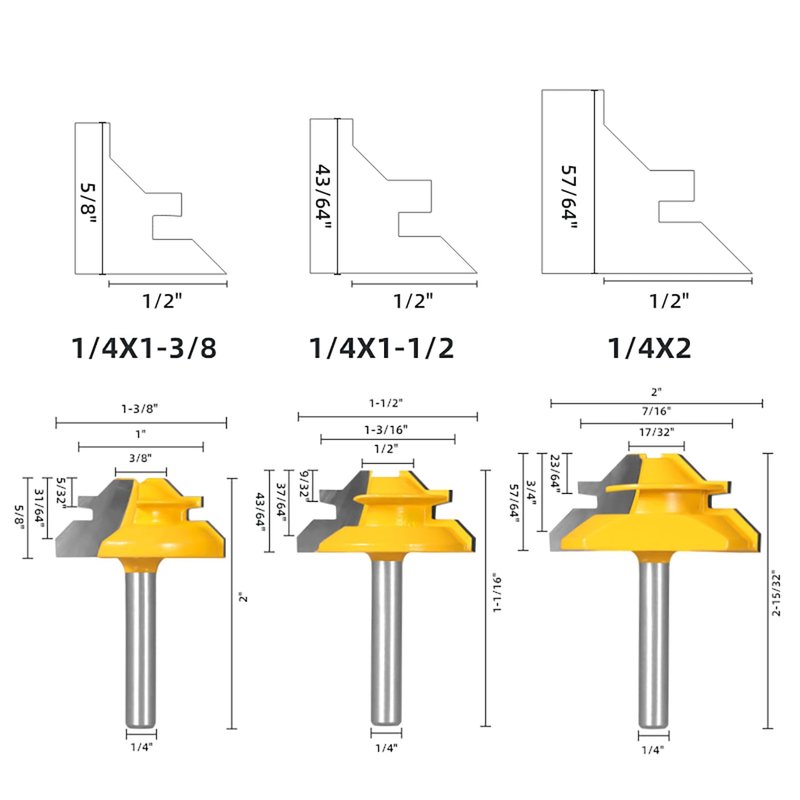 - TOTOWOOD 3Pcs 45 degree lock miter router bit,1/4 inch shank,for 31/64", 37/64",3/4" cutting height,for all woodworking enthusiasts.