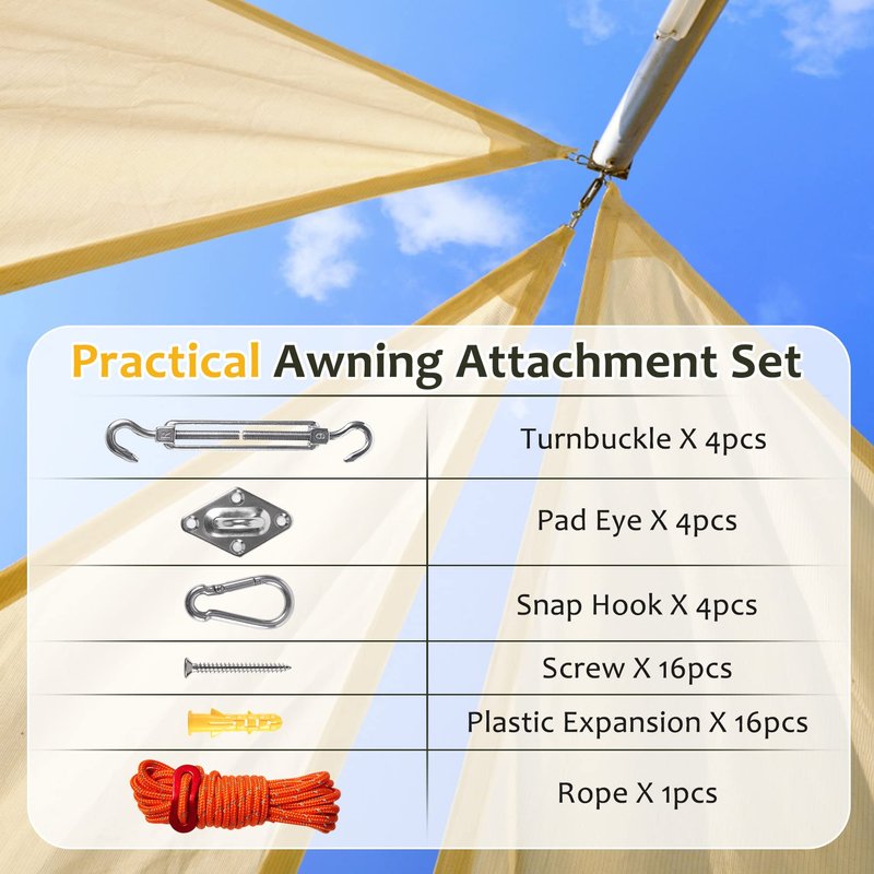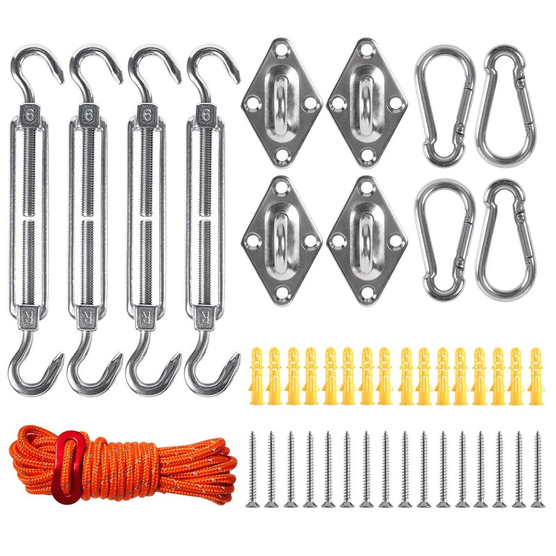 - Hardware for Shade Sail Includes:This sun shade sail kit includes: Turnbuckle( 5.7") x 4pcs, Pad eye x 4pcs, Snap Hook x 4pcs, Screw x 16pcs, Plastic expansion x 16pcs, Rope(157") x1pcs.
