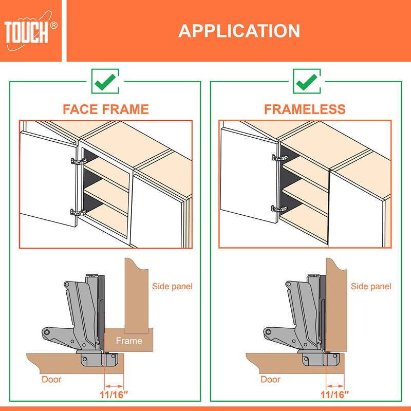 - Applications: Our 165 Degree Self closing cabinet hinges are compatible with face frame or frameless cabinets and it can be conveniently installed for use with new cabinets, or as a replacement for old kitchen corner cabinet hardware.