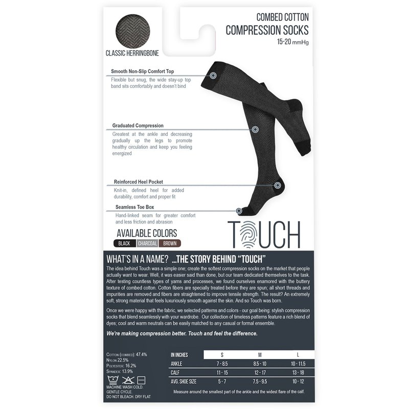 TOUCH Compression Socks for Women, 15-20 mmHg, Herringbone, Cotton, 1 Pair, Charcoal, Medium