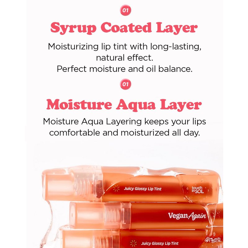 - VIBRANT AND MOISTURIZING COLORS: The Vegan Again Juicy Glossy Lip Tint is not just your average lip tint. Enjoy vibrant jelly lip gloss with high pigmentation and an intense shine great for both warm and cool undertones. With its moisture aqua layering, your lips stay hydrated for a long-lasting dewy effect.