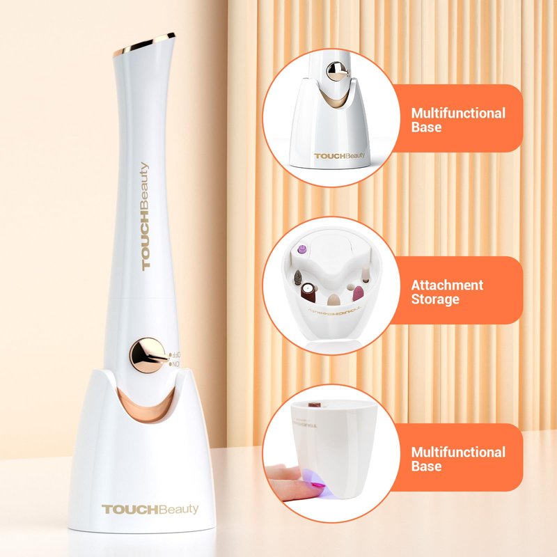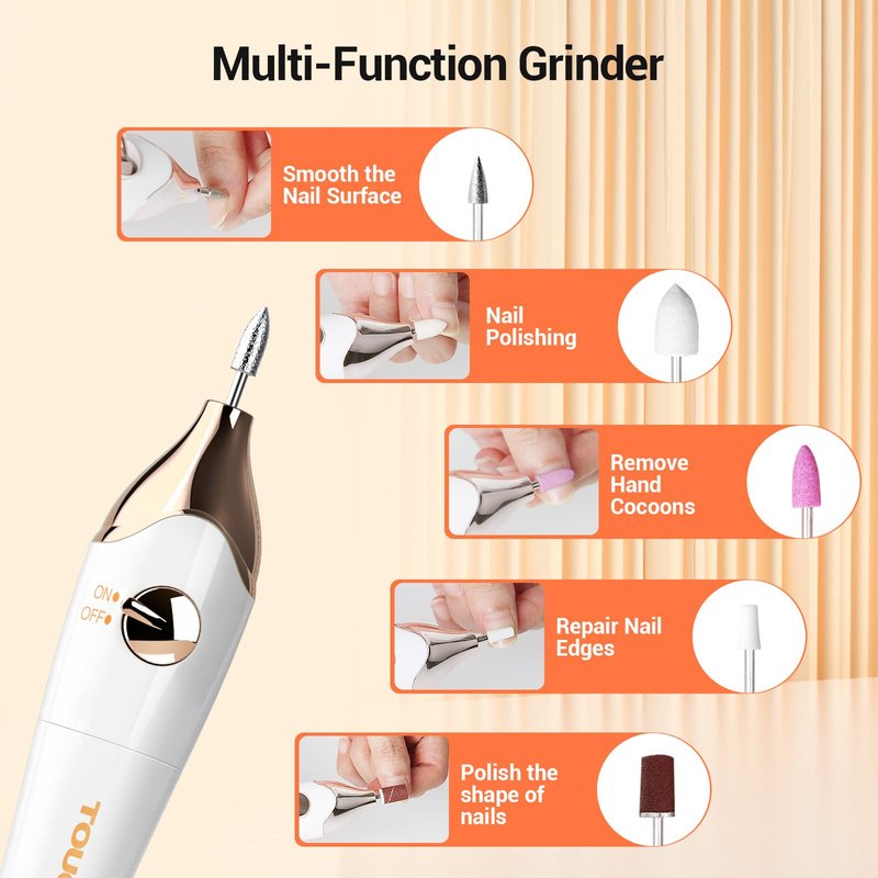 TOUCHBeauty 10 in 1 Electric Manicure/Pedicure Set is a multi-functional Nail Care device, designed for engrave, grind, sharpen, sand, polish, drill and more. can be used for natural nails as well as on artificial nails. This Pen-shape Nail File Drill comes with five optional attachments for different nail-care needs - carving, grinding, sharpening, polishing, drilling, shine nails, remove excess cuticles, smooth corns and calluses and so on. Ideal tools for professional use or home use. Stronger motor allows for better manicure and pedicure effect! Low noise and slight vibration for smooth and long-time operation. Comes with a storage base help you stand and organizes all the accessories nicely. Battery operated manicure kit, requires 2 AAA batteries (not included). Cordless pedicure kit with an ergonomic design easily used and comes with comfortable handle and storage case.You can make your Beauty Nail in any position easily for home use.you don't need to worry about power outlets or cables. it's lightweight, you can take it when you go to travel or outside. 5 Interchangeable Attachments: Sandpaper grinder:quickly grinds the nail edge into your desired shape. Chromium corundum grinder: grinds down the edge White corundum grinder:polishes the nail surface for a smoother and nicer look. Carborundum grinder:Removes the dead skin cells around the the nail edge. Felt grinder:polishes the nail for a natural and shiny surface.