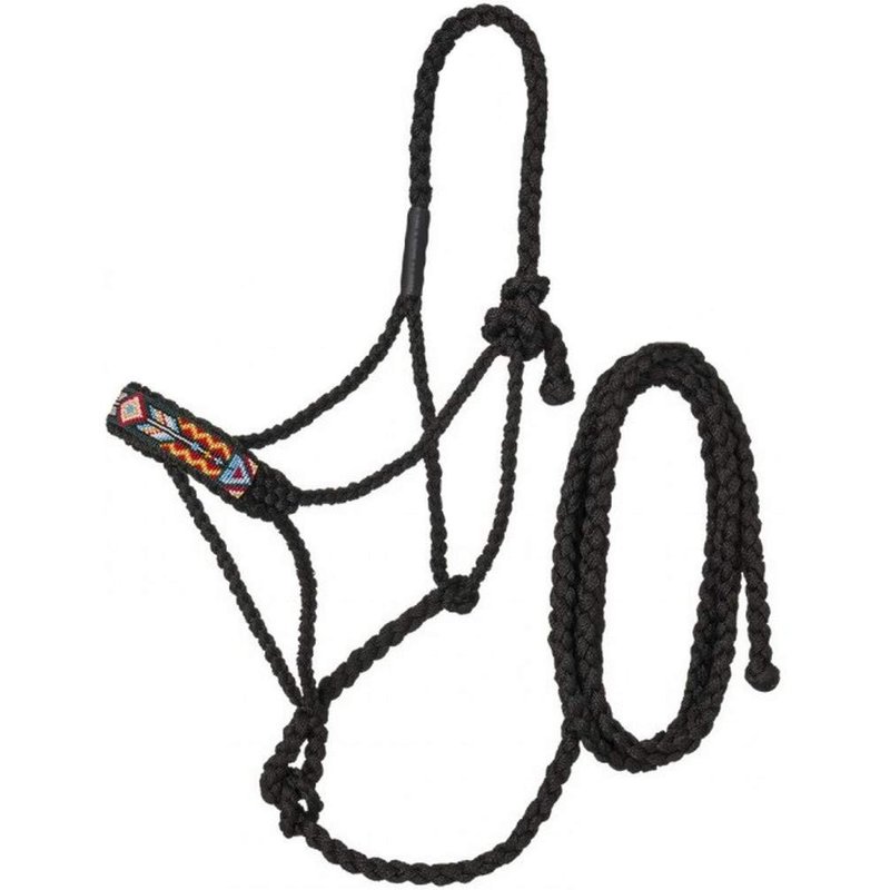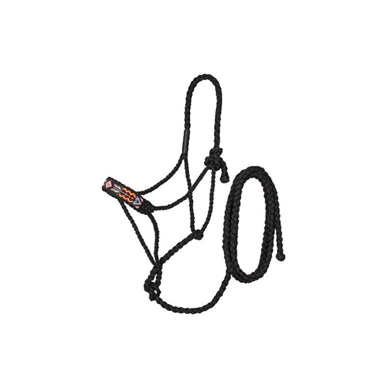 Tough 1 by JT InternationalMule Tape Halter Arrow Beading Pattern on Nose10ft loop end lead rope that is removableBlackLightweight yet strongWide soft plaited noseBraided cheeks and crownAdjustable tie closure58-9875A lightweight but durable halter with soft plated nose and braided construction. The beaded nose adds some colorful western flair to the traditional mule tape halter design without compromising its strength. Includes 10ft removable lead rope great for those unexpected “training” moments. Loop end on lead rope allows option for adding a snap. One size fits most. Choice of 4 original Tough1 exclusive bead patterns.California Prop 65 Warning