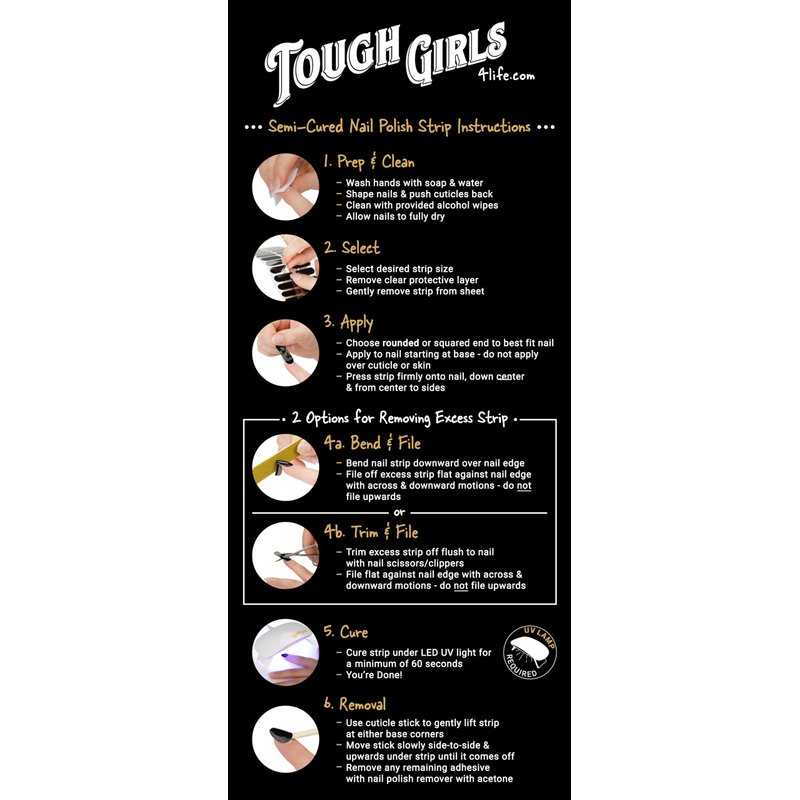Whether going out on the town, working in the office, catching a class, dishing out dinners, or tucking in little ones, TOUGH GIRLS offers beautiful and affordable nail polish strips to accent any outfit or event. With over 100+ designs available, TOUGH GIRLS offers one of the widest selections of today's trendiest colors, designs, and finishes. TOUGH GIRLS salon-quality nail strips include a protective top coat, color coat, base coat, and non-toxic adhesive layer. Best of all, we are the ONLY nail polish strip provider with a 100% ADHESIVE GUARANTEE – WITH FREE REPLACEMENTS! With our easy-to-apply and long-lasting strips, you'll not only impress your family and friends, but you'll also save time and money in the process. You just might wonder why you ever went to the nail salon in the first place! Stay Smart. Stay Strong. Stay Beautiful. Stay Tough! ***Tips for best results: 1) Do not apply semi-cured strips in direct sunlight 2) Store/use at room temperature 3) Use immediately after opening 4) Avoid excessive heat (showers, baths, hot tubs, dishes, stovetop/cooking, etc.) for first 6-8 hours 5) Do not allow strips to hang over nail front edge - file clean to nail edge to avoid getting caught on hair, clothes, sheets, etc. 6) Do not overstretch nail strips – may cause color/design distortion or bubbling 7) Buff/smooth ridged nail surfaces to help avoid tiny air bubbles 8) After a few hours apply a clear topcoat for added protection 9) Strong sunscreens/lotions may cause strips to become tacky 10) Do not apply strip over cuticle or skin - may cause peeling around those edges***