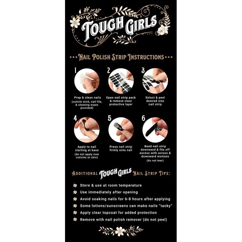 Whether you are going out on the town, working in the office, catching a class, dishing out dinners, or tucking in little ones, TOUGH GIRLS offers beautiful and affordable nail polish strips to accent any outfit or event. With over 60+ designs available, TOUGH GIRLS offers one of the widest selection of today's trendiest colors and designs. TOUGH GIRLS salon-quality nail strips are brighter, thicker, and tougher, consisting of a top coat, color coat, base coat, and non-toxic adhesive layer. With our easy-to-apply and long-lasting strips, you'll not only impress your family and friends, but you'll also have the opportunity to save time and money in the process. You just might wonder why you ever went to the nail salon in the first place! Stay Smart. Stay Strong. Stay Beautiful. Stay Tough! ***Tips for best results: 1) Store/use at room temperature 2) Use immediately after opening 3) Avoid heavy soaking of nails (showers, baths, swimming, hot tubs, dishes, etc.) for first 6-8 hours 4) Apply nail strips prior to bed – allows adhesive to set 5) Do not allow strips to hang over nail front edge - file clean to nail edge to avoid getting caught on hair, clothes, sheets, etc. 6) Do not overstretch nail strips – may cause color/design distortion or bubbling 7) Buff/smooth ridged nail surfaces to help avoid tiny air bubbles 8) Apply clear topcoat for added protection 9) Sunscreens/lotions may cause strips to become tacky 10) Do not apply strip over cuticle or skin - may cause peeling around those edges***
