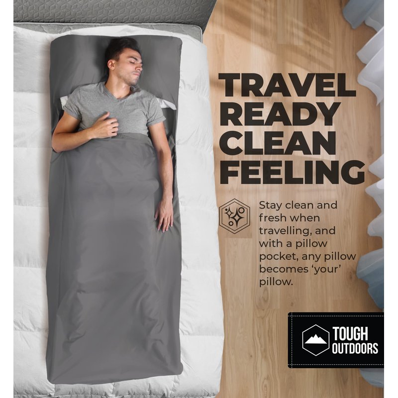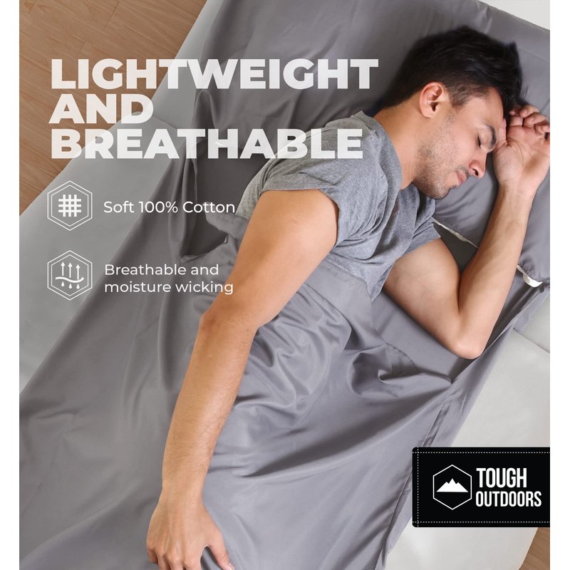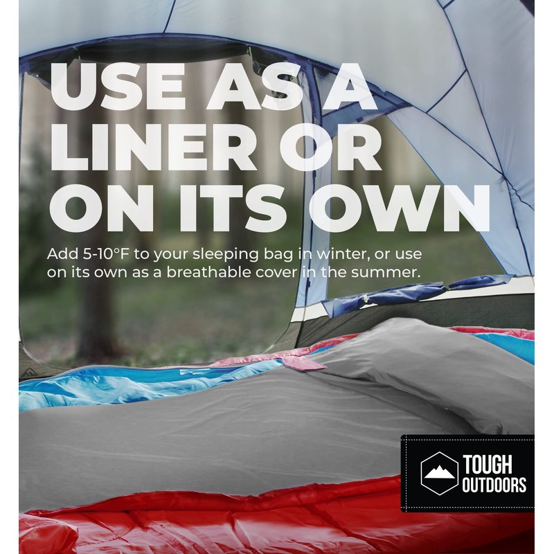 Bring the Warmth of Home on Every Epic Adventure! Protect your sleep away from home with Tough Outfitters’ XL Summer Sleeping Bag Liner. Just slip this sleeping bag liner travel into your sleeping bag to extend its life.Or use it as an extra sheet when couchsurfing or hostel jumping. When you're sleeping inside Tough Outfitters' thin sleeping bag, cotton sleeping bag, the familiar feeling of home is a snore away. They’re extremely portable, sleeping bag liner zipper, but also provide unmatched comfort & cleanliness while you snooze. Bringing a pillow? Sleep sack adult travel. Slip it inside the pillow liner & you now have an outdoor sleeping experience that only TOUGH can deliver. You can also choose from zippered or non-zippered liners for big and tall individuals. Hassle-free Maintenance. Adding extra gear to your backpack shouldn't stress you out. Lucky you, TOUGH is here to rid one less thing off your plate. Toss the liner in the wash or hand wash & hang to dry. The Nitty-Gritty Details. Here's a camping gear must haves with your sleeping bag insert: Temperature rating: Additional 5-10°F, Color: Gray, Navy Blue or White, Liner material: 100% polyester or cotton, Dimensions: Single 86.5" x 31.5"/ Double 85" x 74" inches. Dimensions when packed: Pocket case 8" x 6" / Stuff sack 8" x 2.5" inches. A Gift That Goes a Long Way. Traveling? Joining summer camp? Anybody who loves to camp needs their Tough Outfitters sleeping sheets for traveling at hand! Consider giving the gift that provides all-year protection to your circle of explorers, including:Boy & Girl Scouts,Hikers, Campers, & Backpackers. Travelers, exchange students, & more! Equip yourself with Tough Outdoors sleeping sack for adults. Don't head outdoors without this camping essential. Add the travel sleeping bag for hotels to your cart TODAY!