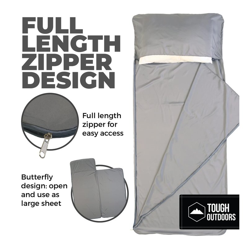 Tough Outdoors Sleeping Bag Liner - Adult Sleep Sack & Travel Sheets - for Backpacking, Hotels & Hostels - Lightweight Single & Double Camping Sleeping Bag Liners - Comfortable, Gray with Zipper