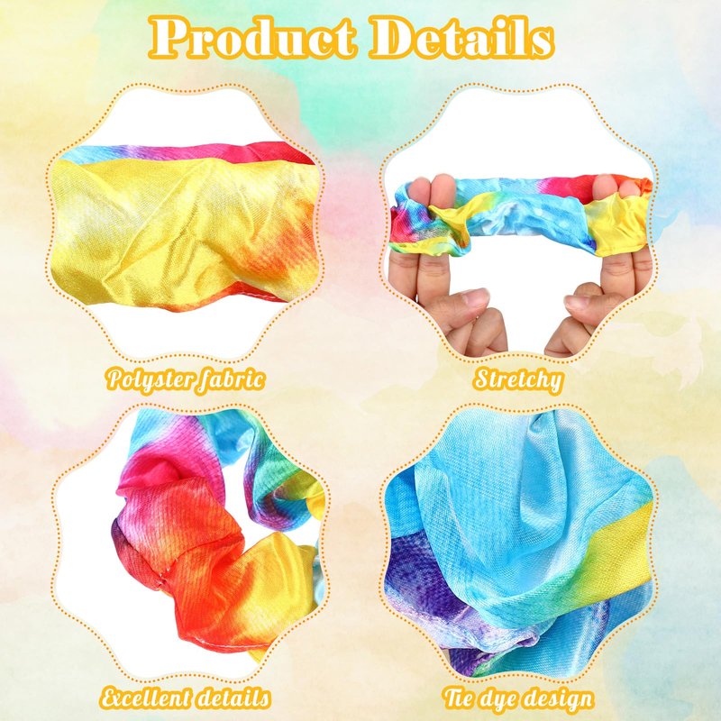 Features: Fashionable hair elastics: Our tie dye hair scrunchies can be applied in various occasions, you can wear them attending parties, ceremonies and daily wearing, practical and useful for your makeup and easy to DIY your own hairstyle, make you look more charming. Ideal gifts: The tie dye scrunchies bulk are nice gifts to send to your friends, colleagues and family members, lightweight and portable, they can wear the scrunchies when going out, so they will be happy to receive such beautiful accessories. Specifications: Material: polyester fabricColor: as shown in picturesSize: as shown in picturesPackage includes: 24 x Tie dye scrunchies Notes: Manual measurement, please allow slight errors on size. The color may exist slight difference due to different screen display.