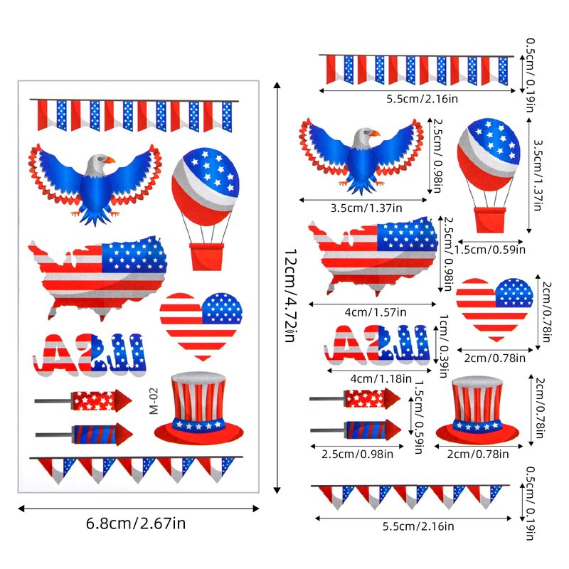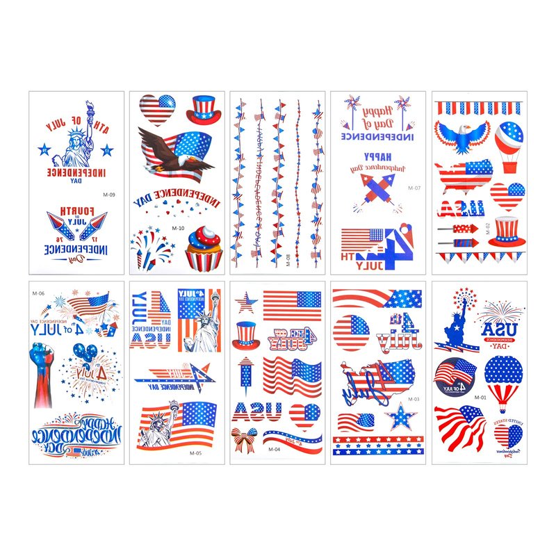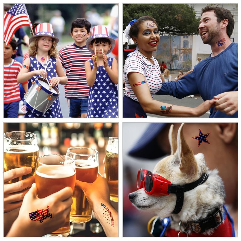 - 【A HUGE Hit at Your Event】Our America Memorial Day Face Tattoos are included different Styles: hat, usa flags, America Maps, , heart, sunglasses, I love usa, eagles, freedom sayings, etc. These 4th of july temporary tattoos stickers will be a huge hit at your independence day party shindig, they're a must for 4th of July shindig and parades. These patriotic tattoos patch are good match for your fourth of July costume outfit !