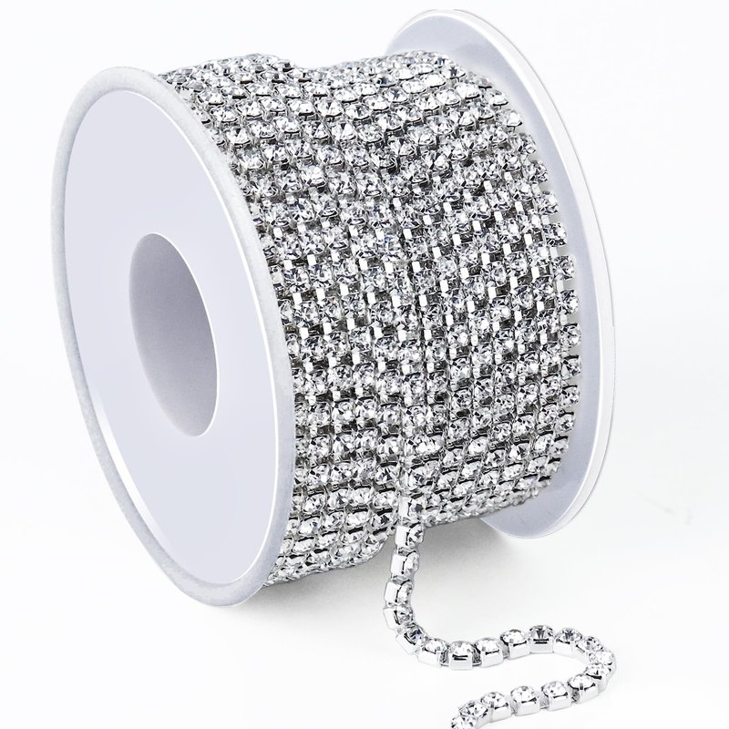 - ▲ Towenm Rhinestone Chain Roll: 10 Yards 1 Roll. Size: SS12 (3mm); Color: Silver Base+Clear Rhinestones