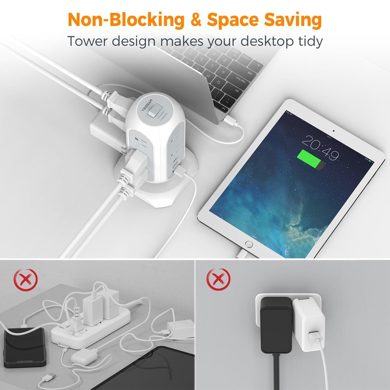 - Space Saving Design: 4-side compact design tower power strip takes up little space on your desk, cleans various cords and make your desktop organized; With 4 rubber feet at the bottom, efficiently keeps this 6 ft extension cord from slipping and sliding