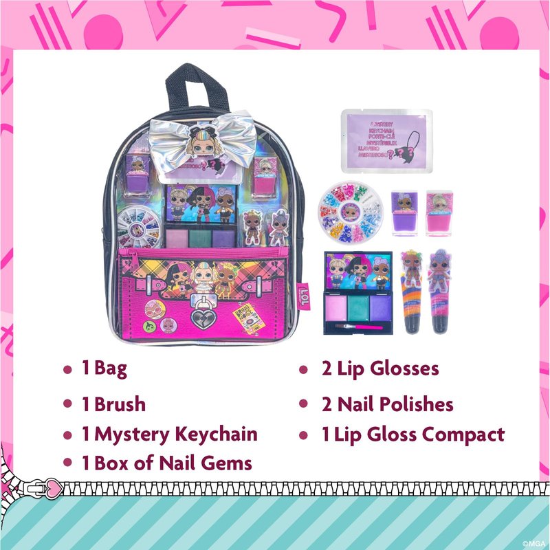 - COMPLETE SET: This all-in-one set includes 2 lip gloss tubes, 1 box of nail gems, 1 mystery keychain, 2 nail polishes, and 1 lip gloss compact, all packed in an L.O.L. make-up backpack.