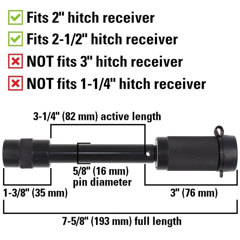 - EXTRA LONG PIN FITS 2" and 2-1/2" RECEIVERS - Extra long 5/8" diameter locking hitch pin with maximum active length 3-1/4", fits Class III/IV hitches with 2" and 2-1/2" receivers. Solid hardened steel tow hitch lock pin with black e-coated on zinc plated finish. * Before purchase, please verify all dimensions of your hitch, to get a great fit of the hitch lock pin