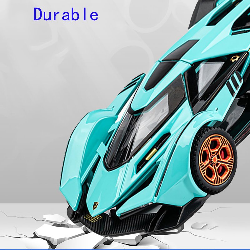 - Sound and light: The front hood of Lambo V12 opens and closes and the whole back opens and closes.It had lights and cool sound effects.The lights work when you press down on the car and the engine roars when you pull it back.