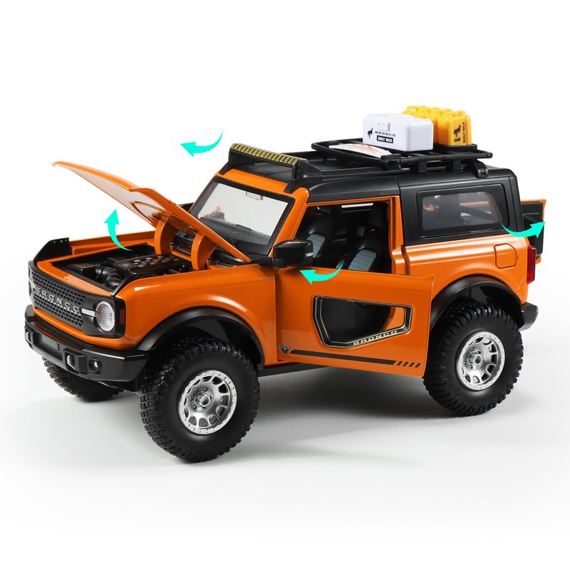 - Bronco Diecast Details: Openable hood, doors, trunk. Press the front wheels or open the doors to trigger light and sound effects.