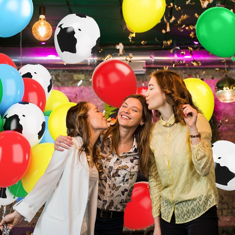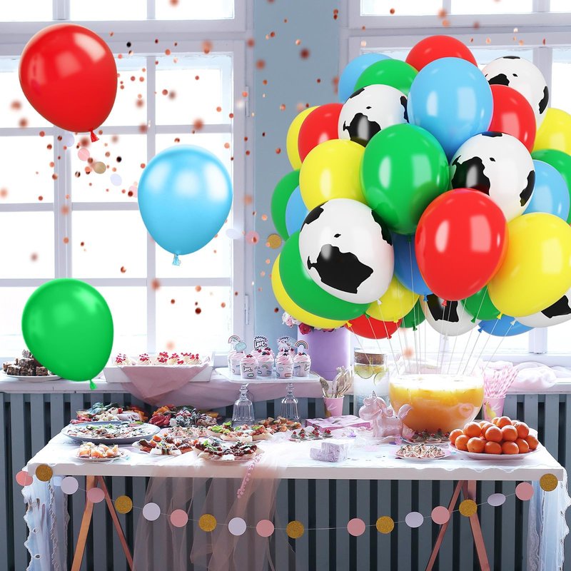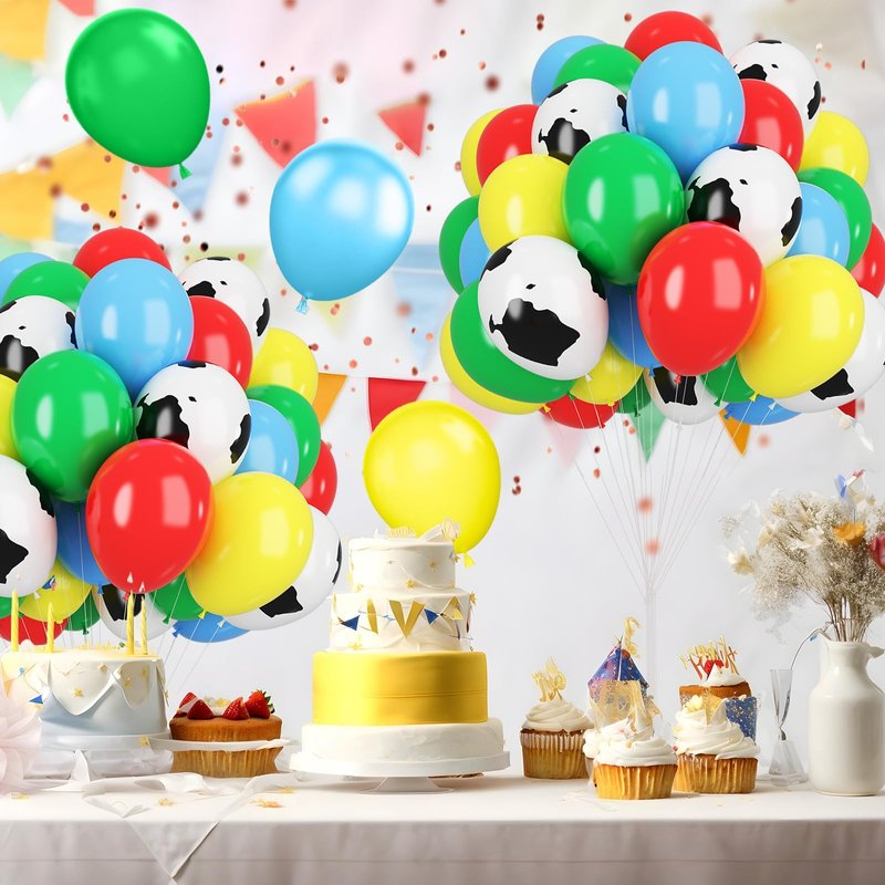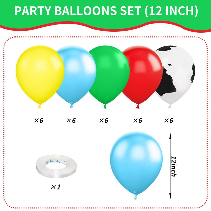 - 12 inch cartoon toy theme balloons set: Package contents include cow printed balloons, blue balloons, red balloons, yellow balloons, green balloons, a balloon ribbon. The color combination satisfies all your party imagination and starts a wonderful party carnival.