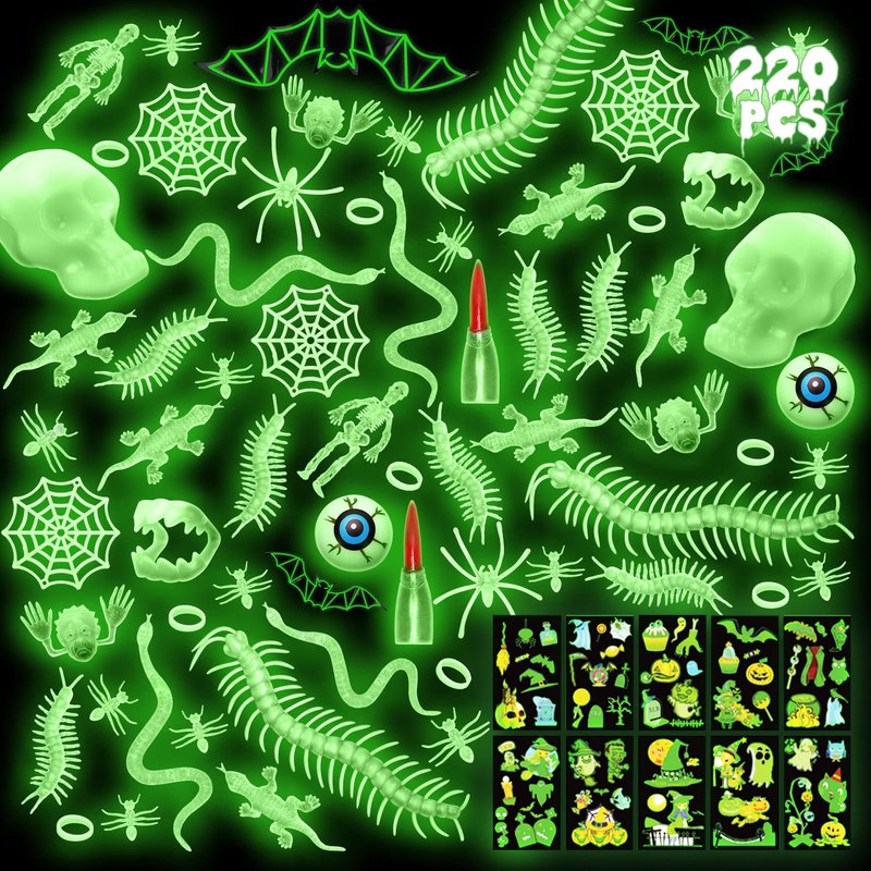 This 220 pieces set of fluorescent toys includes spiders, large centipedes, braces, skeletons, small centipedes, lizards, small snakes, bats, eyeballs, ants and many other fun fluorescent Halloween toys for kids .