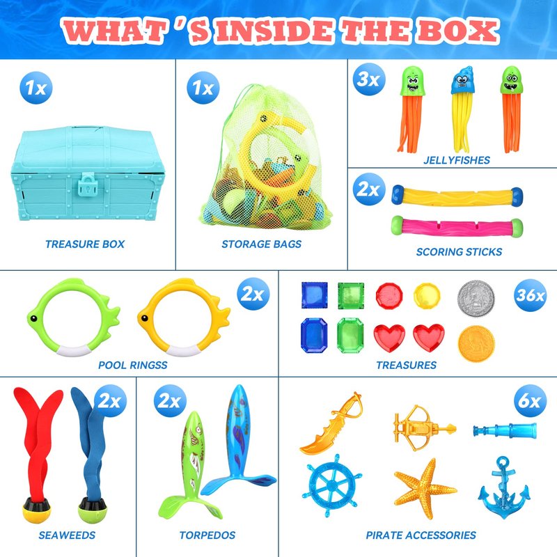 - 💎 DIVE FOR SUNKEN TREASURE: This diving toys set includes a treasure chest, plastic coins, glittering jewels dive gems, pirate toys, pool torpedo and more. Dive for the full chest, or scatter the treasures all over the pool! Will you gather them all before it’s time to go home?