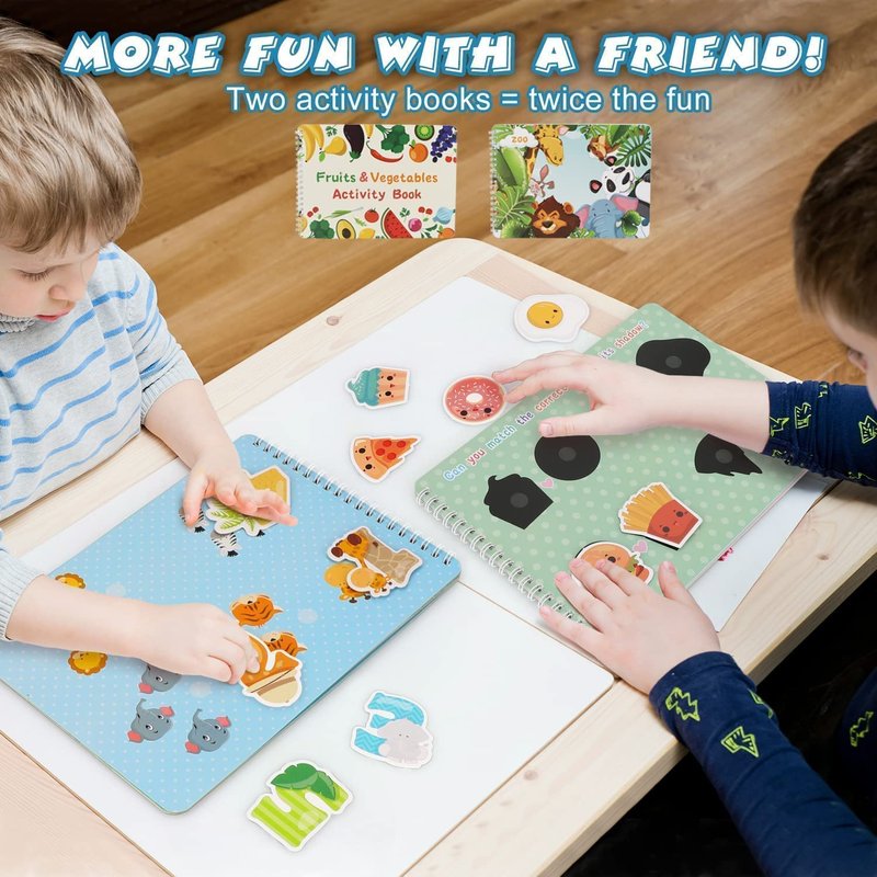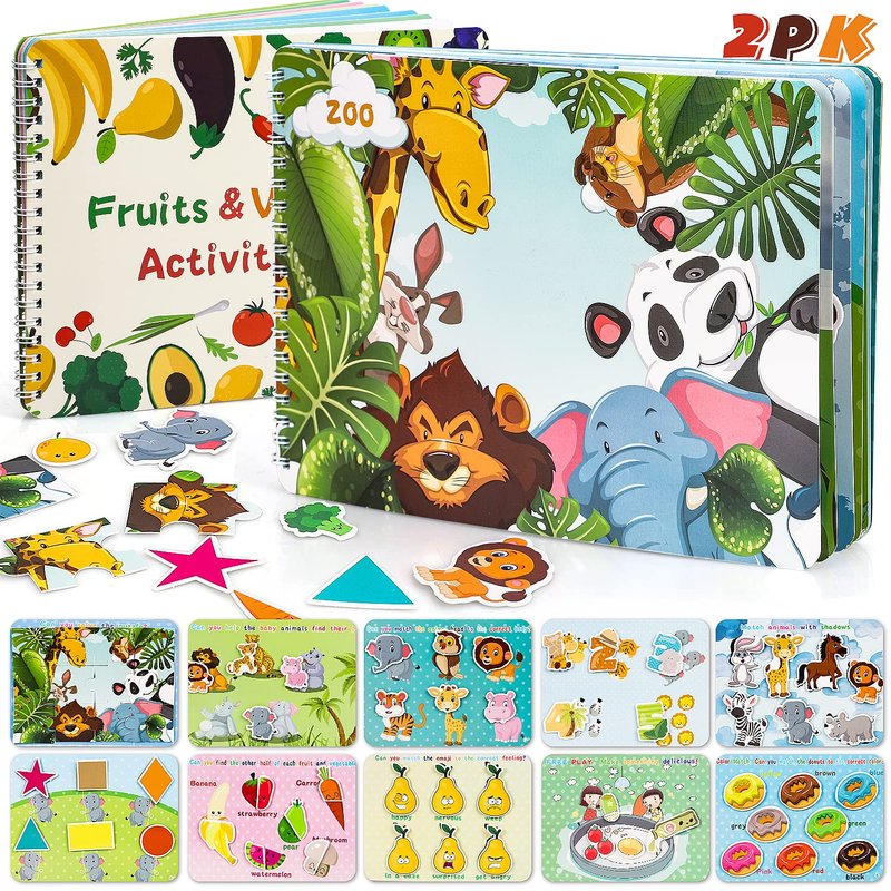 - ANIMALS, FRUITS, AND VEGETABLES: This toddler sticker activity book gets toddlers curious about their surroundings, teaching them about different animals and foods. Help the animals find their homes, learn the names of different species, and match the correct yummy food order to its shadow!