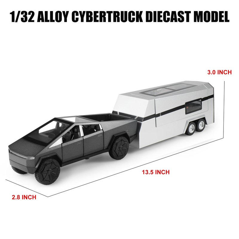 - CYBERTRUCK TOY: 1/32 Cybertruck metal die-cast model measures 7.0” X 2.75” X 2.8” (Trailer RV measures 7.0” X 2.75” X 2.95”). This Cybertruck toy is crafted with realistic details of the real Cybertruck vehicle, a metal body with plastic parts, rubber tires, and detailed interior and exterior trim.