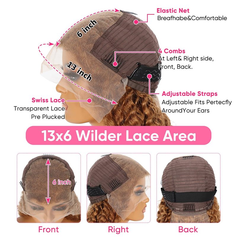 - Honey Blonde Deep Wave Lace Front Wigs Human Hair Cap Details: Honey Blonde Wig Human Hair, Medium Cap Size: 21.5-22.5 Inch, 3 Combs to Fix on Head,2 Adjustable Straps Can be Adjusted to Different Head Size.