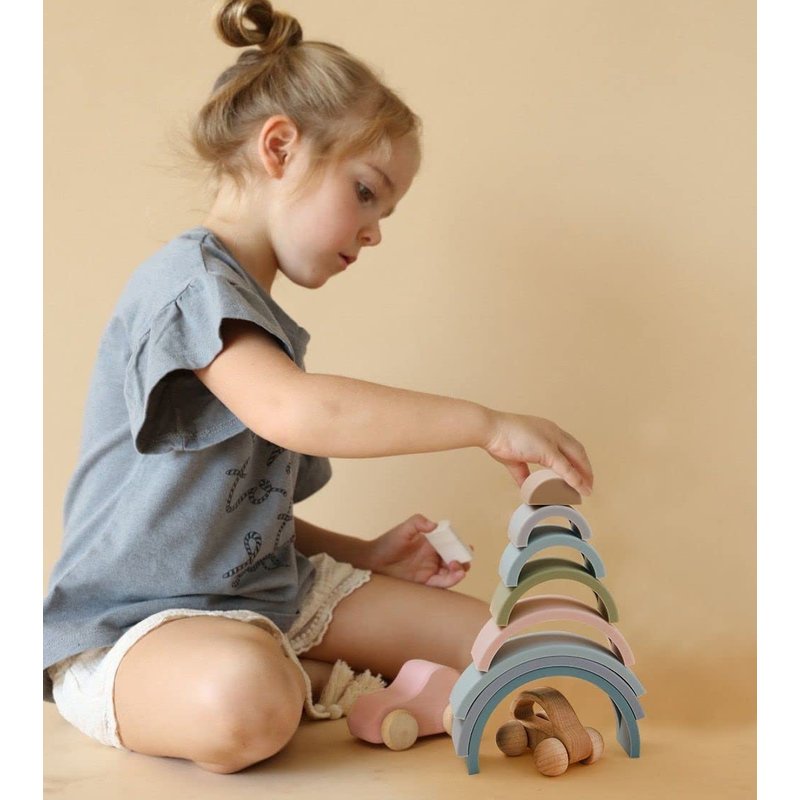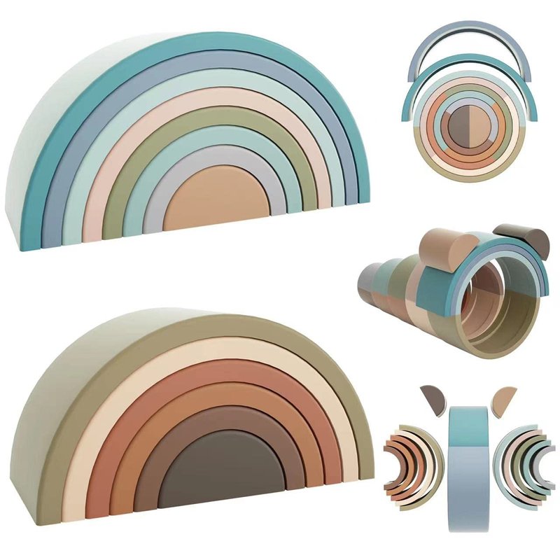 - 🌱【SAFETY MATERIAL】-- 100% made of high-quality food-grade silica gel, no peculiar smell, free of BPA, phthalates, cadmium and lead. Compared with the wooden rainbow stacker, the silicone material has no risk of paint falling and paint damage, and is not easy to break. It has greater friction than wood, more stable, easy to clean, and washable.