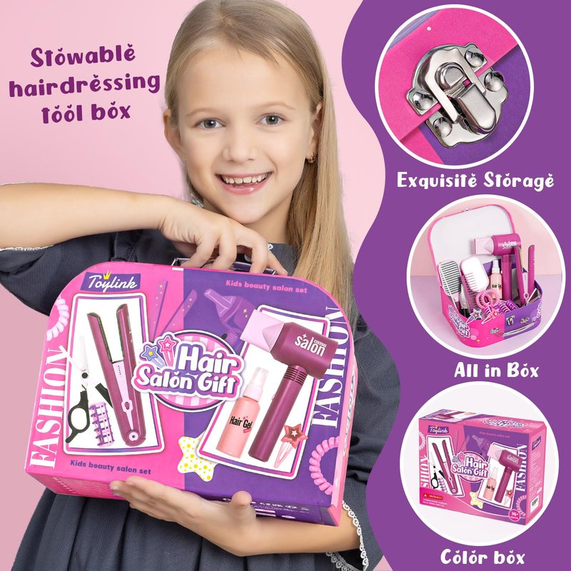 - HAIR STRAIGHTENER & STORAGE BOX: Our hair straighteners allow girls to pretend to design any look they want, elegant straight hair and playful curls are a girl favorite! We also come with a stand to simulate a more realistic hairdressing scene! In addition, we have carefully designed a portable storage box that can hold all the accessories, so that girls can easily bring their hair tools to play with friends, become a hair stylist, and show their creativity and talent
