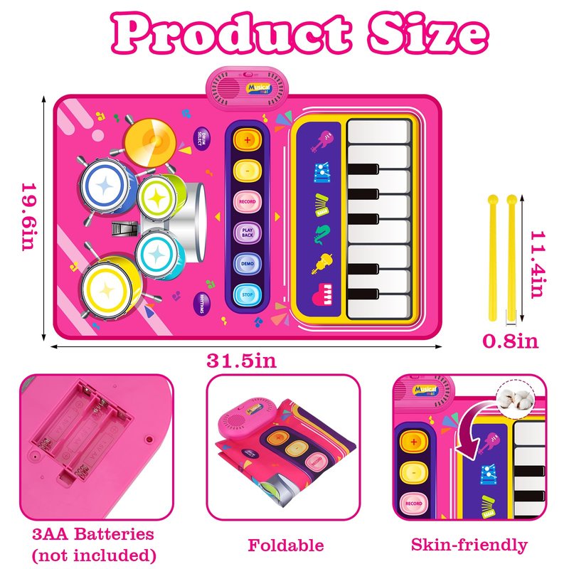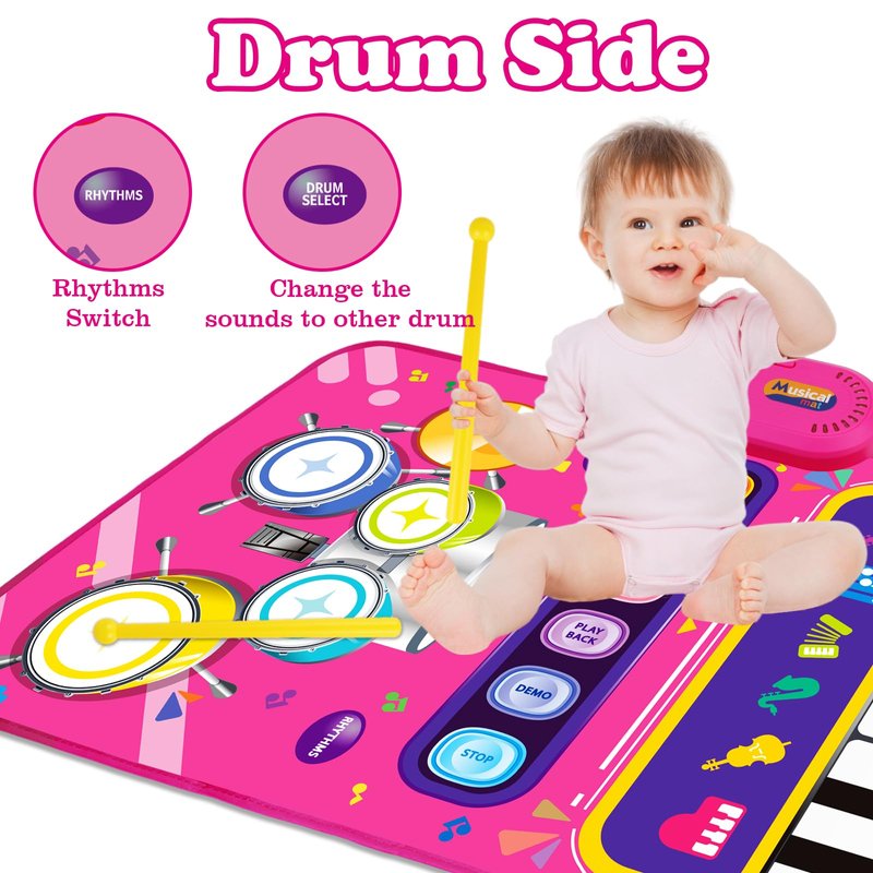 - MULTIFUNCTIONAL BABY TOYS: 2 in 1 baby music playing mat for 1 year old girl and boy help baby learn to play many different styles of music. The piano side has the sounds of 6 instruments (piano, violin, vibraphone, trumpet, accordion, guitar) and 13 piano keys. As a 1 year old girl gifts , the drum side comes with 2 drumsticks for fun drumming. Perfect Easter toys 12-18 12-24 months.
