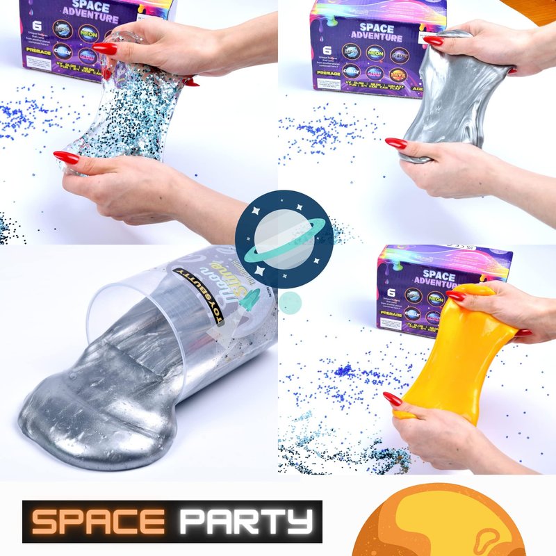 - SLIME KIT SPACE ADVENTURE PARTY FAVORS - The most amazing Galactic Sensory Slime by stretching the galaxy slime in this slime toys set for kids and interact with the universe playing and decorating with space slime charms, immerse in the universe. This slime kit includes 6 Slimes with different colored premade textures stretchy slime feel. create kids space 6 dreams fly to another planet.