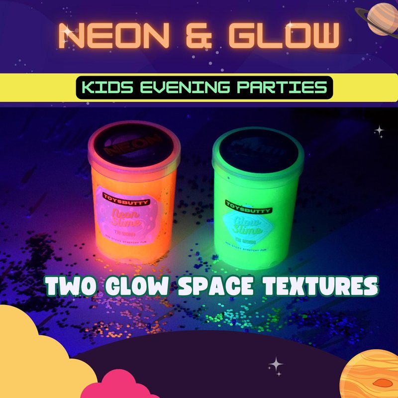 - NEON & GLOW IN THE DARK SLIME - Party even at night with kids by Enjoy the 2 slimes that can glow around in the room! Spacy lights are magic for slime parties, Neon will glow to you uner UVS, the glow in the dark slime lights up like an alien ship , jump in that alien ship and have great fun.