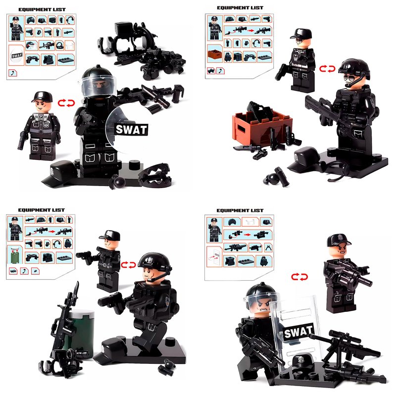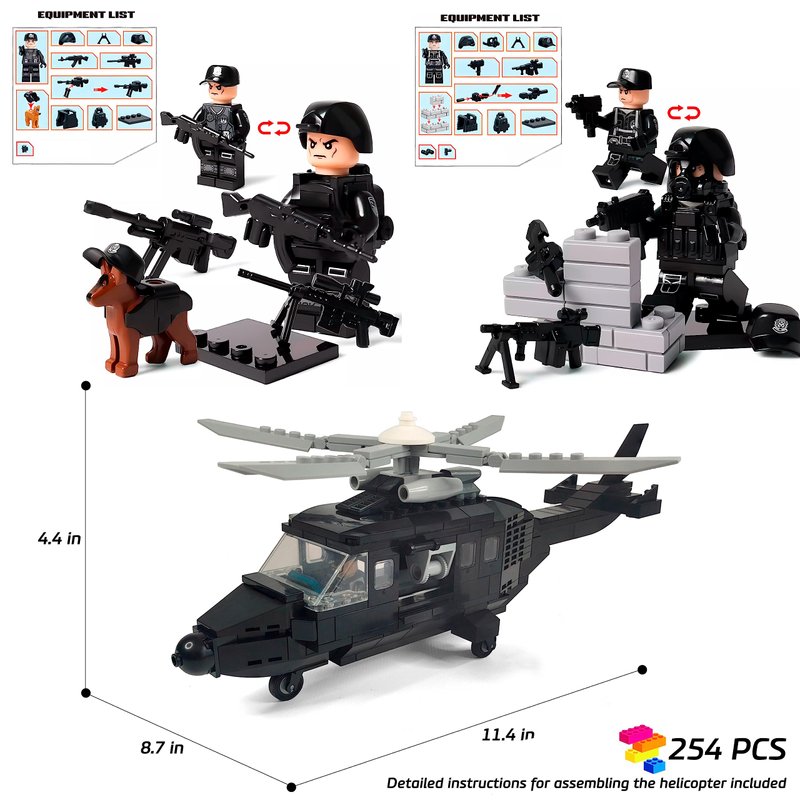 - The set includes 8 pcs SWAT army miniature special forces figures with weapons and personal policeman uniform (swat team gear) + Helicopter + Dog. The whole set is packed in OPP bags