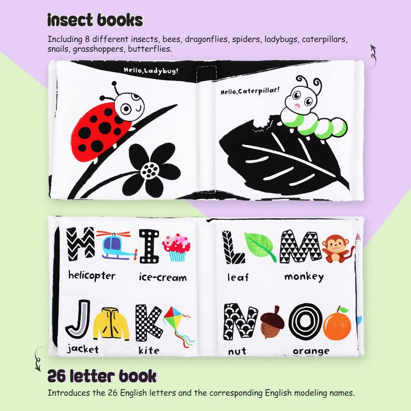 - Two kinds of book combinations: book, including 8 different insects, bees, dragonflies, spiders, ladybugs, caterpillars, snails, grasshoppers, butterflies; 26 letter books, introducing 26 English letters and corresponding the English modeling name of; the of two books allows your baby to learn more and richer knowledge.