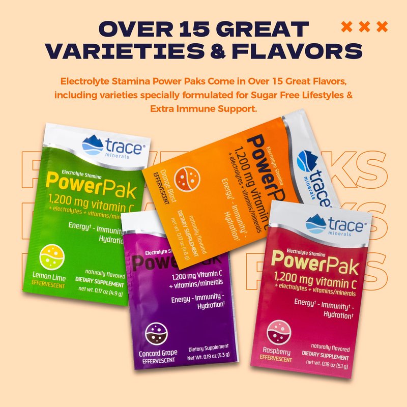 Power up and revitalize with Electrolyte Stamina Power Pak by Trace Minerals. Electrolyte Stamina Power Pak is an easy-to-fix high performance effervescent multivitamin energy drink mix powder with no caffeine, artificial flavors, or artificial stimulants. Our formula is Non-GMO and contains 1200 mg of Vitamin C, an essential nutrient for people who are active and on the go, as well as Zinc and B Vitamins. It also contains all major electrolytes (potassium, magnesium, chloride and sodium), plus a full spectrum of ionic trace minerals from ConcenTrace Ionic Trace Minerals, which supports the assimilation and absorption of vitamins and nutrients. This low sugar formula is available in a wide variety of fizzy flavors that offer great taste without junky ingredients. They come in convenient individual packets you can take anywhere. Take 1 packet daily. Open packet, pour powder drink mix contents with 2-3 oz. of water & dilute to your taste preference. Additional packets may be taken depending on physical activity. Some caking may occur but does not affect the quality of the product. Trace Minerals is America’s #1 Trace Minerals Supplement Brand. Since 1972, Trace Minerals brand has been recognized around the world as the pioneer of ionic trace mineral products that have supported consumers in living healthy lives. All products are third-party tested to give you the highest quality and maximum absorption. Feel the difference with Trace Minerals!