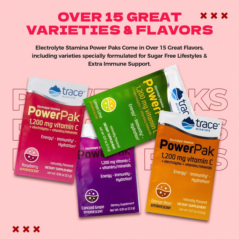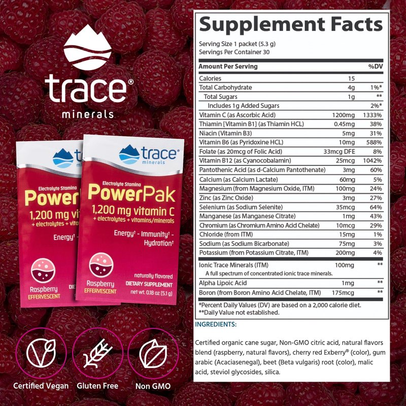 Trace Minerals | Power Pak Electrolyte Powder Packets | 1200 mg Vitamin C, Zinc, Magnesium | Boost Immunity, Hydration and Natural Energy | Raspberry | 30 Packets