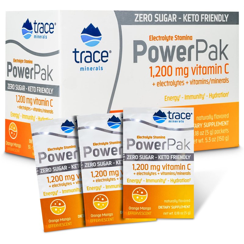 Trace Minerals | Power Pak Sugar Free Electrolyte Powder Packets | 1200 mg Vitamin C, Zinc, Magnesium | Boost Immunity, Hydration and Natural Energy | Keto Friendly | Orange Mango | 30 Packets