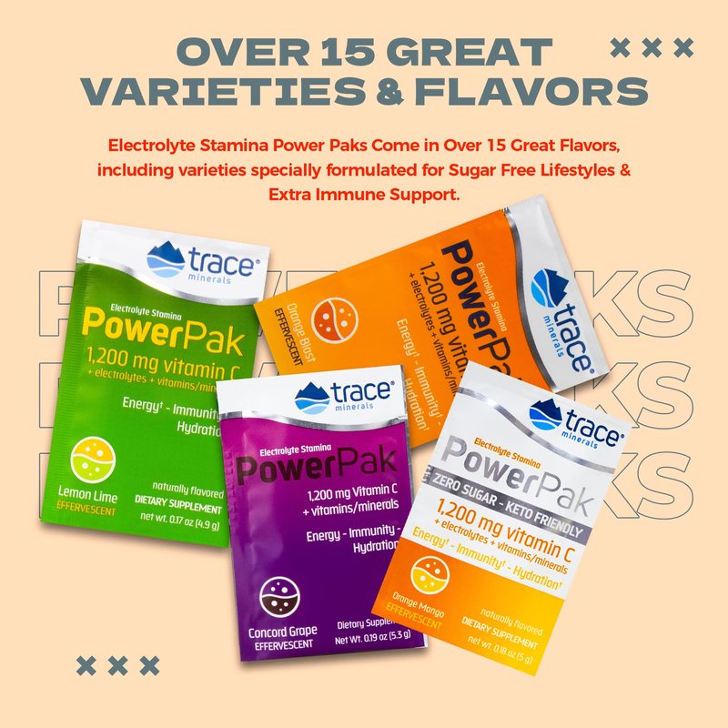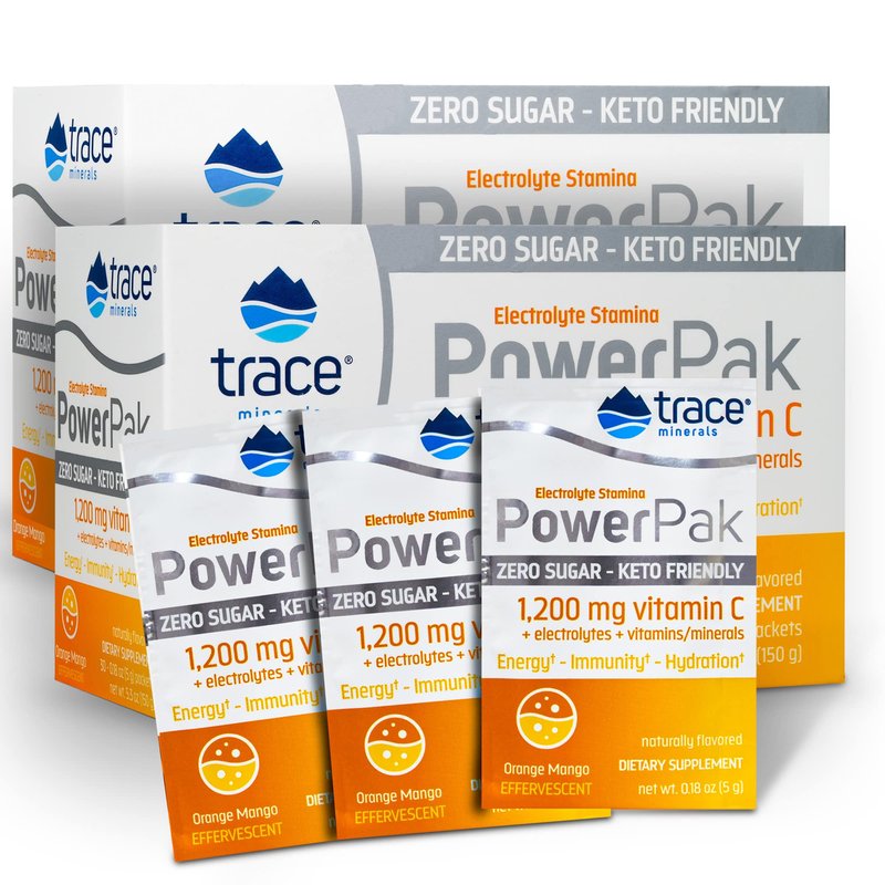 Trace Minerals | Power Pak Sugar Free Electrolyte Powder Packets | 1200 mg Vitamin C, Zinc, Magnesium | Boost Immunity, Hydration and Natural Energy | Keto Friendly | Orange Mango | 60 Packets
