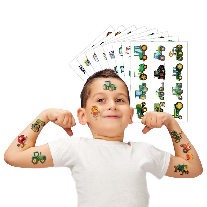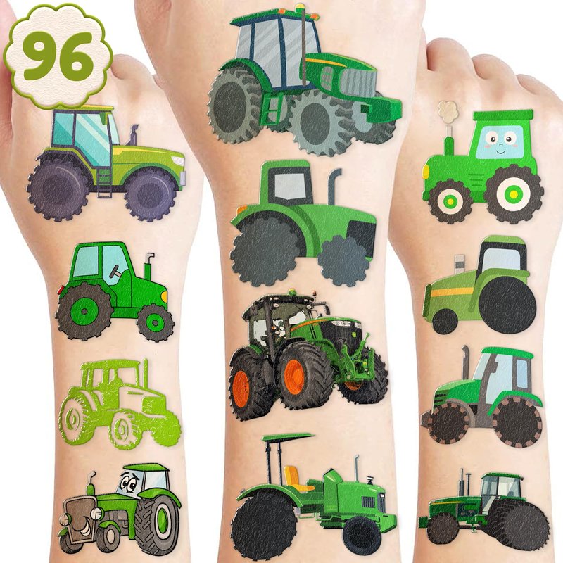 🚜【PERFECT TATTOOS FOR THEMED TRACTOR PARTY DECORATIONS】: Tractor temporary tattoo stickers include 8 sheets in total. There are 96Pcs super cute tattoo differences. Perfect for giving out party favors and holiday theme small gifts. The size of each sheet is 6.1 * 3.1 inches. One size fits kids. 🎁【GREAT GIFT IDEAS FOR TRACTOR PARTY SUPPLIES DECORATIONS】: You will receive many compliments when you decorate your child's birthday party with a Tractor theme. Tractor tattoos are a small gift you should not pass up for your kids. 🌍【SAFE AND ENVIRONMENTALLY CONSCIOUS】: Our temporary tattoos are made from materials that are safe and prioritize sustainability. These tattoos are created using paper that is both safe for users and friendly to the environment. 🌴【EASY TO USE AND REMOVE】: Cut each tattoo out of sheets and remove the sheet clearly. You can stick it on hands, face, arms or wherever you feel safe. Moreover, you put it down on glasses, clothes, and a smooth flat . After that, you wet it thoroughly with water and wait for 20-30 seconds, you get rid of the backing paper. As a result, you have a velvety tattoo as we say. 👍【PERFECT SERVICE】If you have difficulty using our product, contact us. We will make sure to solve problems and help you have a wonderful buying experience. 【 Not recommended for people with a history of sensitive skin, if symptoms appear, stop using immediately】